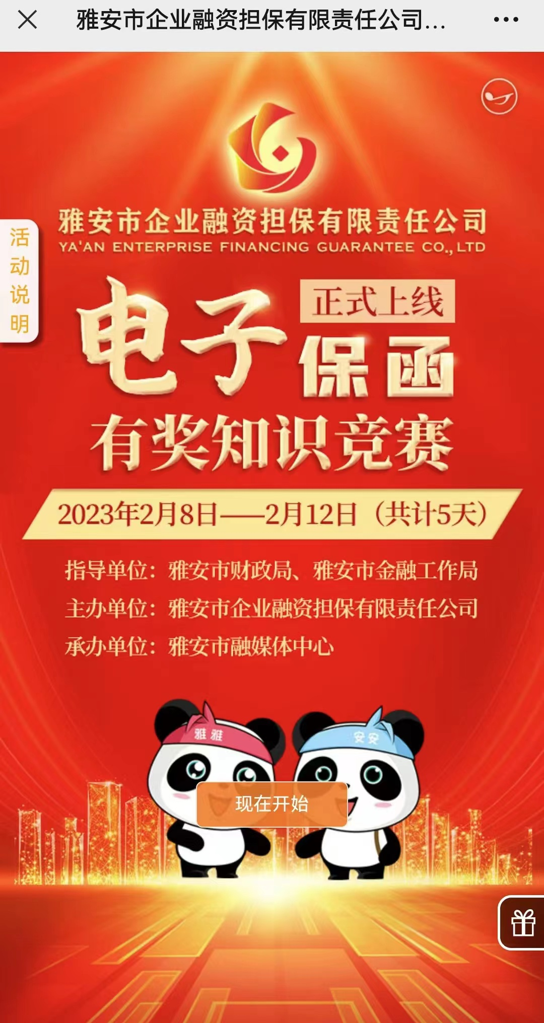 該活動由市財(cái)政局和市金融工作局指導(dǎo),雅安市企業(yè)融資擔(dān)保有限責(zé)任公司(以下簡稱“市擔(dān)保公司”)主辦,雅安市融媒體中心承辦。市擔(dān)保公司作為我市唯一一家政府性融資擔(dān)保機(jī)構(gòu),也是雅安公共資源交易中心上線的唯一一家本地全類別保函服務(wù)商。2月6日,市擔(dān)保公司“電子投標(biāo)保函”業(yè)務(wù)在雅安公共資源交易中心正式上線。為讓更多的受眾了解“電子投標(biāo)保函”業(yè)務(wù),市擔(dān)保公司主辦了此次線上有獎知識競賽活動。