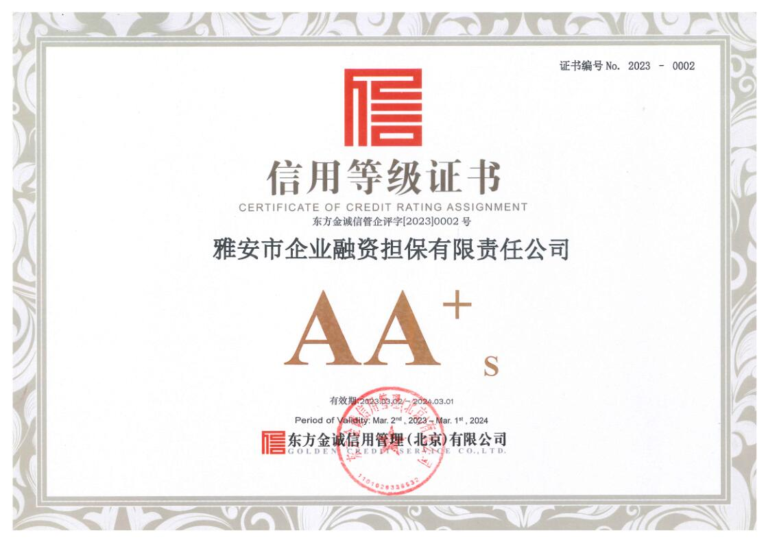 33日,雅安市企業(yè)融資擔(dān)保有限責(zé)任公司(以下簡稱市擔(dān)保公司傳來喜訊,經(jīng)東方金誠信用管理(北京)有限公司通過對市擔(dān)保公司的信用狀況進(jìn)行綜合分析和評估,確定該公司信用等級為AA+。