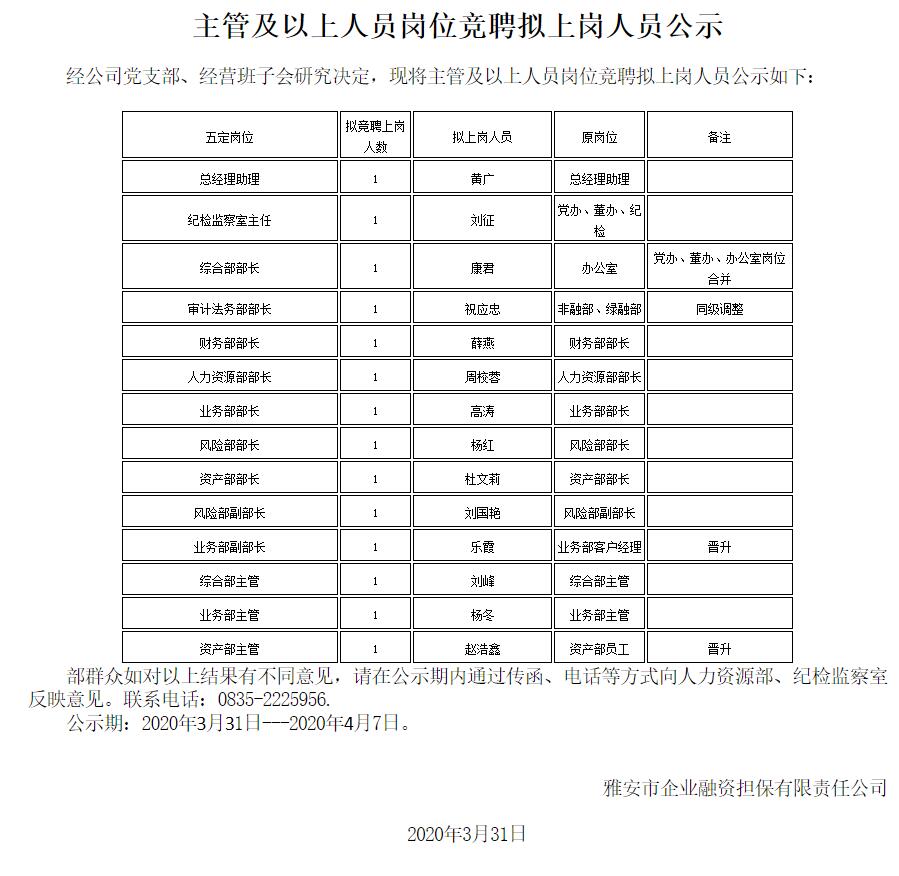 主管及以上人員崗位競(jìng)聘擬上崗人員公示